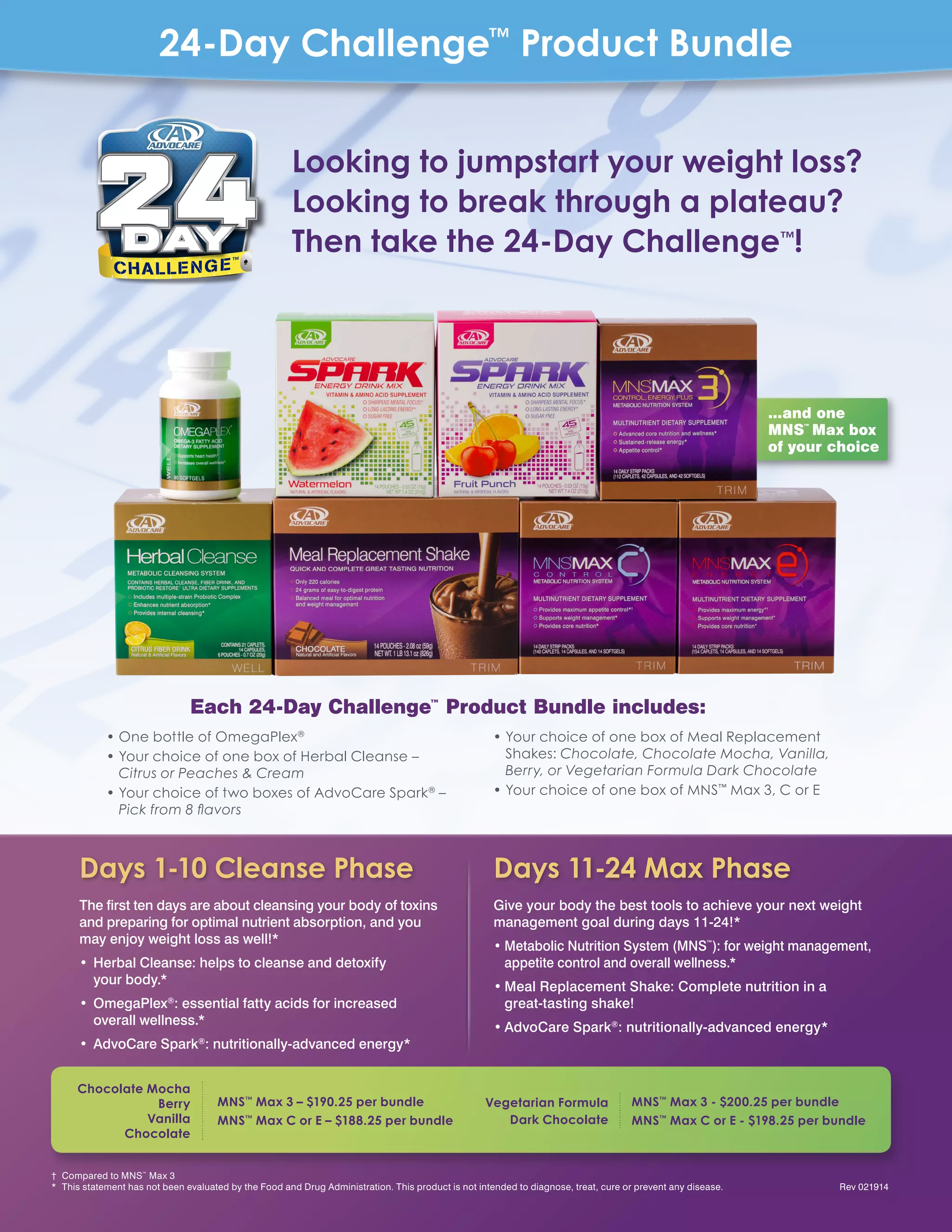 The 24-Day Challenge product bundle is designed to help users cleanse their body and lose weight over two phases in 24 days. The first 10 days focus on cleansing and detoxifying the body with herbal supplements while potentially enjoying weight loss. Days 11-24 aim to support weight management and overall wellness with meal replacements, energy supplements, and the Metabolic Nutrition System for appetite control. The bundle includes various supplements and products to choose from for both phases of the challenge.