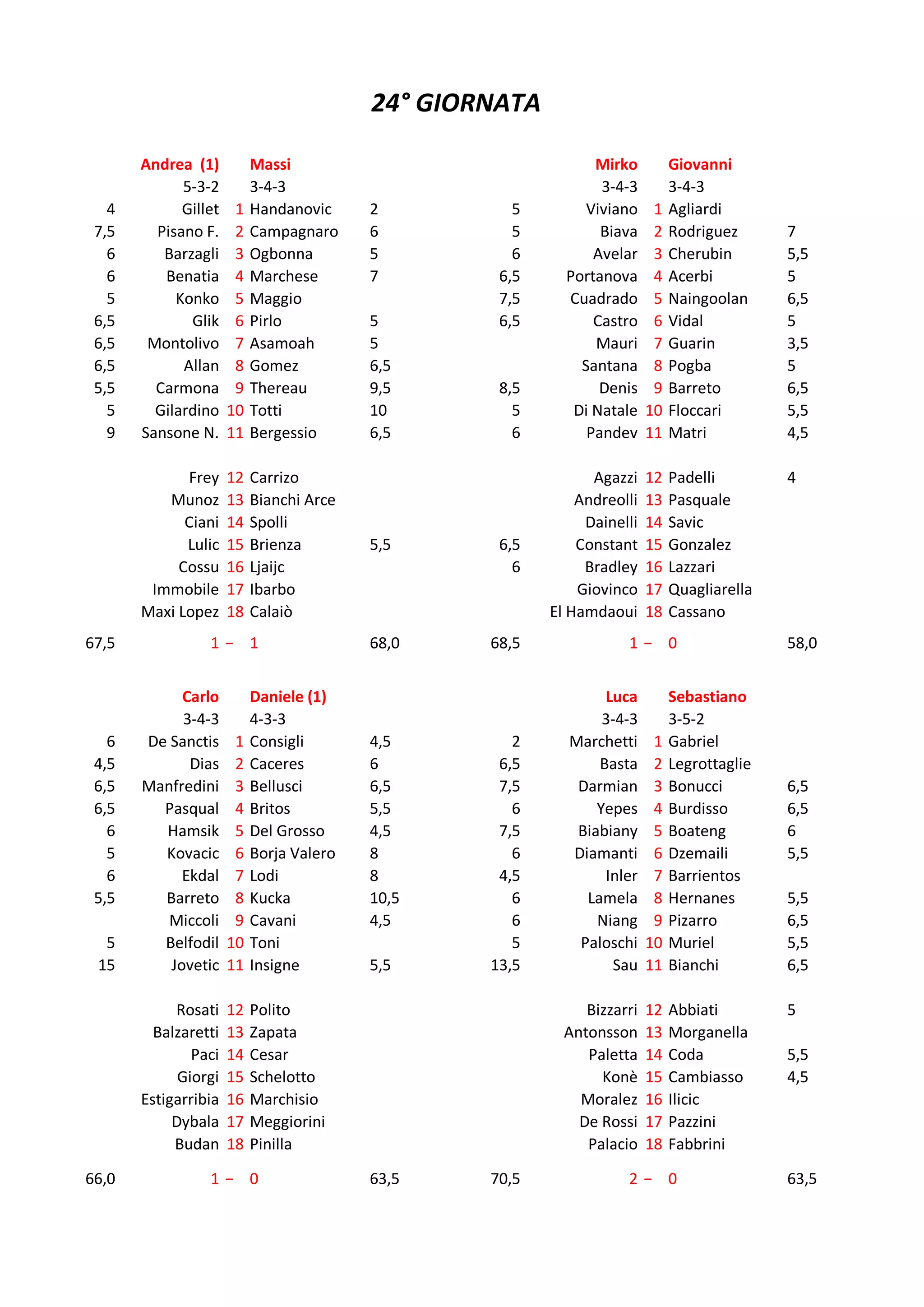 Il documento contiene un'analisi delle prestazioni dei giocatori di calcio nella 24° giornata di campionato, con diverse formazioni segnalate e voti attribuiti a ciascun giocatore. Le valutazioni variano da 1 a 10, riflettendo le performance individuali. Sono inclusi dettagli sulle squadre, formazioni e statistiche di gioco.