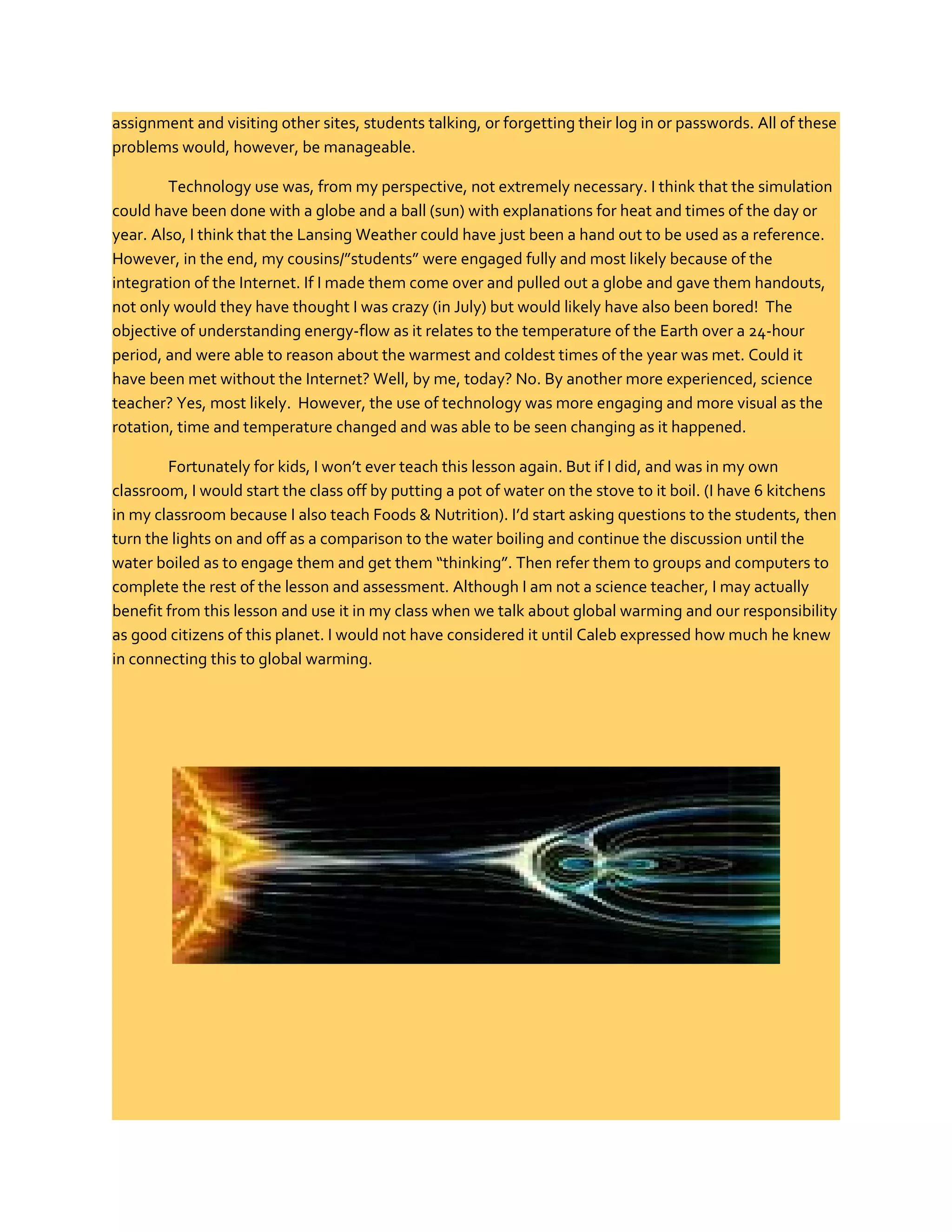 The author had difficulties completing the lesson plan assignment due to it being July and finding students. They convinced their cousins to act as students instead. The author followed the 24 Hour Temperature Lesson plan, having the cousins use an online simulation to learn about how temperatures change throughout the day and year based on the Earth's rotation. While not an expert in science, the author felt the lesson was successful and the cousins were engaged, likely due to the integration of technology into the lesson.