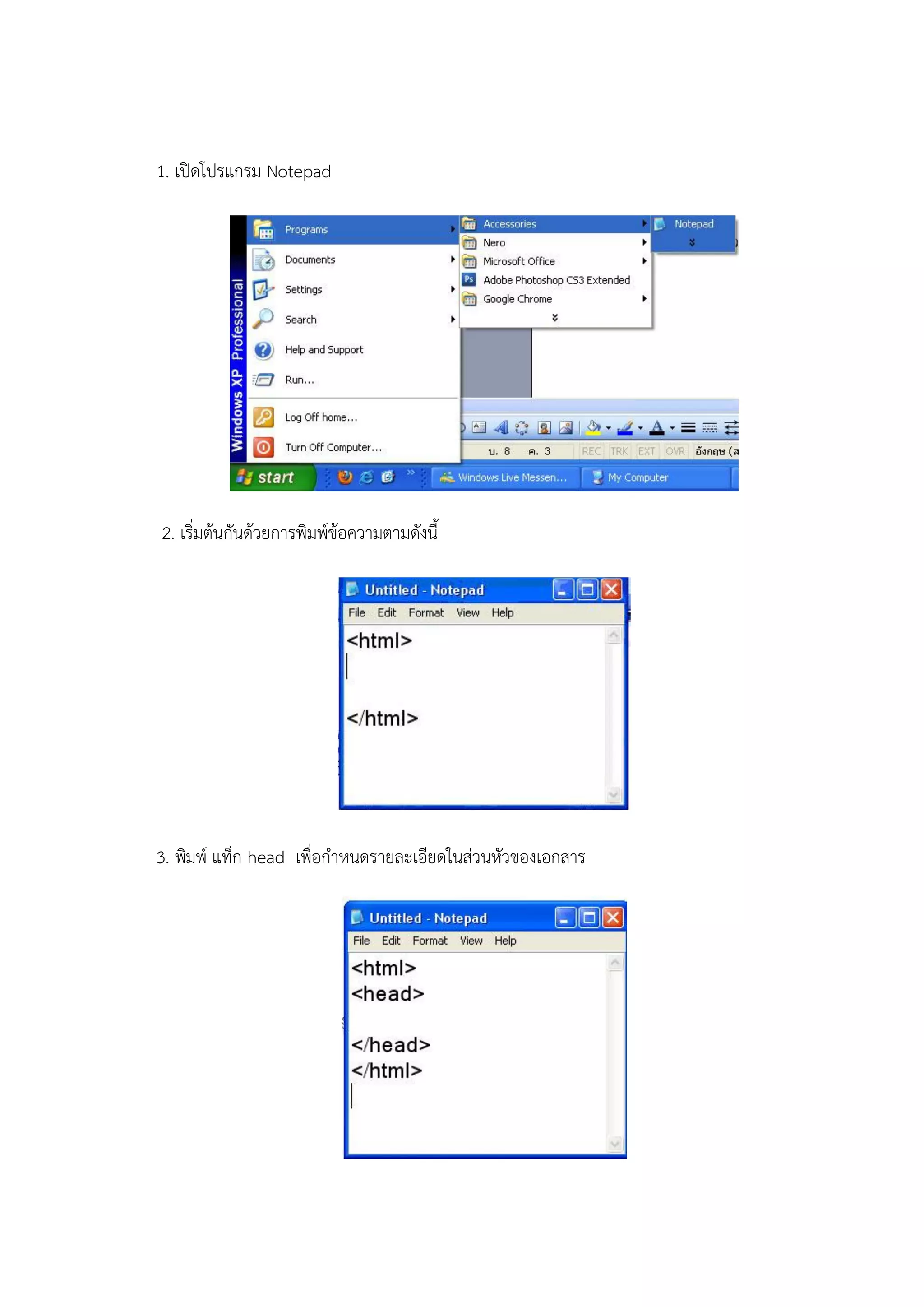 ขั้นตอนการสร้างเว็บเพจด้วย HTML ในการสร้างเว็บเพจ สามารถสรุปขั้นตอนได้ ดังนี้ 1. สร้าง Folder เพื่อเป็นที่เก็บข้อมูลต่างๆ ของเว็บ 2. สร้างเว็บเพจด้วยโปรแกรม Notepad และทาการจัดเก็บในโฟล์เดอร์ที่สร้างขึ้นในข้อ 1 3. ดูผลลัพธ์จากการสร้างเว็บเพจ ด้วยโปรแกรมเว็บบราวเซอร์ เช่น Internet Explorer 1. สร้าง Folder เพื่อใช้สาหรับเก็บข้อมูล การทางานในระบบคอมพิวเตอร์ ข้อมูลต่างๆ ไม่ว่าจะเป็นเอกสาร รูปภาพ เสียงเพลง จะถูก เก็บลงระบบคอมพิวเตอร์ในรูปแบบของ แฟ้มข้อมูลหรือที่เรียกกันว่า ไฟล์ (File) โดยไฟล์แต่ละประเภท จะมีนามสกุล (Extension) ที่แตกต่างกันไป ตามลักษณะของข้อมูลและโปรแกรมที่สร้างข้อมูลนั้น เช่น ไฟล์เอกสารที่พิมพ์ด้วยโปรแกรม Microsoft Word จะมีนามสกุลคือ .doc ไฟล์รูปภาพอาจมีได้หลายนามสกุล แต่ประเภทของรูปภาพที่นิยมใช้ในการสร้างเว็บเพจคือ .jpg และ .gif ไฟล์เสียงเพลง จะมีนามสกุลดังนี้ เช่น .mid , .wav หรือ .mp3 เป็นต้น ไฟล์ข้อมูลเว็บเพจ จะมีได้หลายนามสกุล เช่น .htm .html .php .asp การเก็บข้อมูลต่างๆ ในระบบคอมพิวเตอร์นั้นเพื่อความเป็นระเบียบ ความสะดวกในการทางาน และการค้นหาข้อมูล ควรสร้างโฟลเดอร์ (Folder) ขึ้นใหม่ นิยมสร้างที่ไดร์ฟ D: โดยตั้งชื่อ folder งานเป็นชื่อของนักเรียน-ชั้น เช่น samorn5-1 เป็นต้น 2. เริ่มต้นสร้างเว็บเพจด้วยโปรแกรม Notepad โปรแกรม Notepad เป็นโปรแกรมที่มีอยู่ในเครื่องคอมพิวเตอร์ทุกเครื่องเป็นโปรแกรมพื้นฐาน การเรียกใช้งานทาดังนี้
