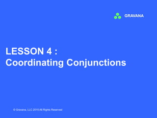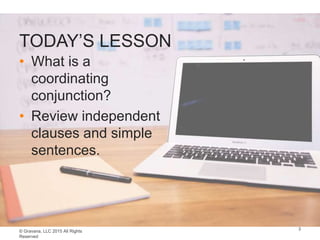 This document discusses coordinating conjunctions and how they are used to combine two independent clauses. It defines a coordinating conjunction as connecting two independent clauses using words like "for", "and", "nor", "but", "or", "yet", and "so", known by the mnemonic "FANBOYS". It provides examples of how to identify independent clauses and properly use a coordinating conjunction with a comma to join two related clauses. The lesson emphasizes that not every word in the FANBOYS list functions as a coordinating conjunction and provides a trick for determining proper use between clauses.