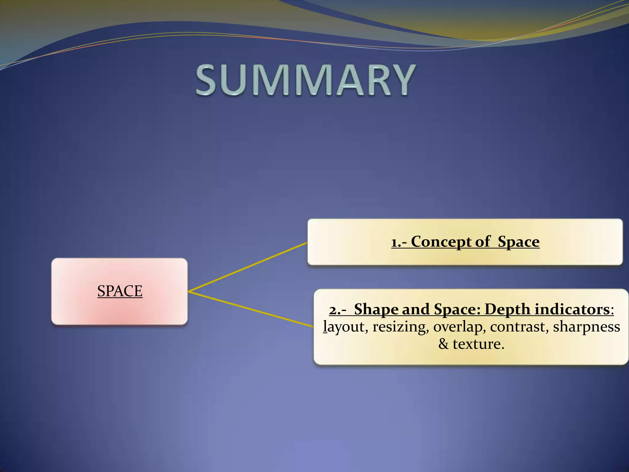 The document discusses the concept of space and how depth is indicated in images. It defines space as the area between objects and discusses techniques like layout, resizing, overlap, contrast, sharpness, and texture that artists use to suggest depth and create a sense of space in two-dimensional images. These techniques are based on how human perception interprets size, placement, and detail to distinguish what is closer or farther away.