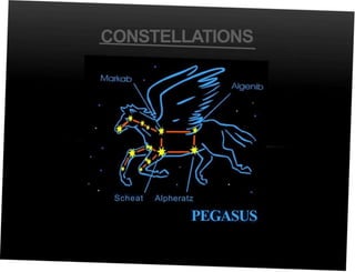 This document provides information about constellations, including descriptions of some major constellations like Orion, Cassiopeia, and Ursa Major. It explains that constellations are patterns of stars in the sky and discusses myths associated with several constellations. It also describes how the earth's rotation makes it appear that stars are moving in the night sky.