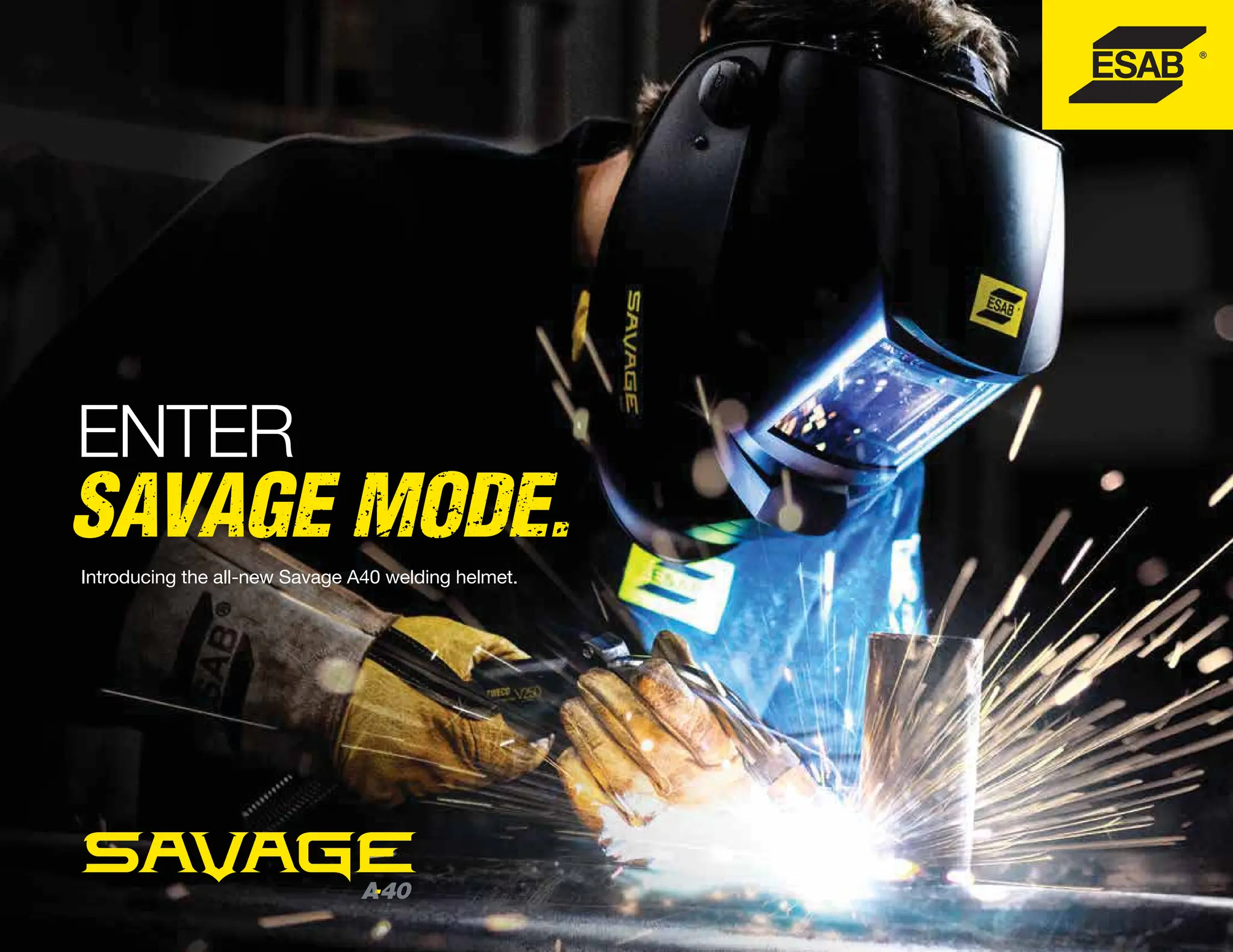The document introduces the new Savage A40 welding helmet. It has a lightweight shell and adjustable headgear for comfort. It features a 1/1/1/2 optical-class lens with true-color technology for enhanced clarity and definition. The helmet has four light sensors for fast auto-darkening response and sensitivity/delay controls inside for easy adjustment. It also has an external grind mode button and shade adjustment knob for convenience. The document provides specifications, ordering information, and compares it to their Sentinel A50 professional welding helmet.
