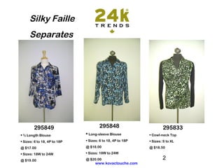 Kovac Industries is a Canadian manufacturer of fashion trends and fabrics. They are introducing their Fall 2012 collection which includes silky faille separates, metro styles, separates pants, dresses, skirts, tops, and Texas denim styles. The collection is available in a range of sizes and prices. Kovac Industries has been in business for over 50 years and develops fashion trends from around the world to adapt for the North American market.