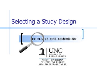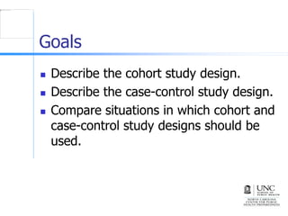 This document describes cohort and case-control study designs. Cohort studies follow groups over time to compare disease occurrence between exposed and unexposed groups. Case-control studies identify people with and without a disease and compare past exposures. Cohort studies are best when the entire population is identifiable, while case-control studies are more efficient when the population is large or undefined. The document provides examples of outbreak investigations that effectively used each design.