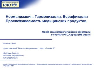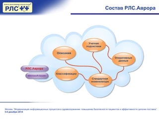 Документ описывает модернизацию информационных процессов в здравоохранении, направленных на повышение безопасности пациентов и эффективность цепочки поставок, проводимых в Москве 3-4 декабря 2014 года. Основные темы включают гармонизацию номенклатуры, прослеживаемость медицинских продуктов и внедрение стандартной номенклатуры с использованием datamatrix-кода. Ведущая компания, группа 'Регистр лекарственных средств России', обеспечивает обработку информации в системе рлс.аврора.