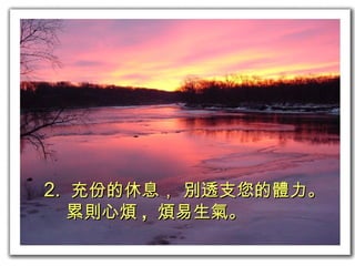2. 充份的休息, 別透支您的體力。 累則心煩 , 煩易生氣。