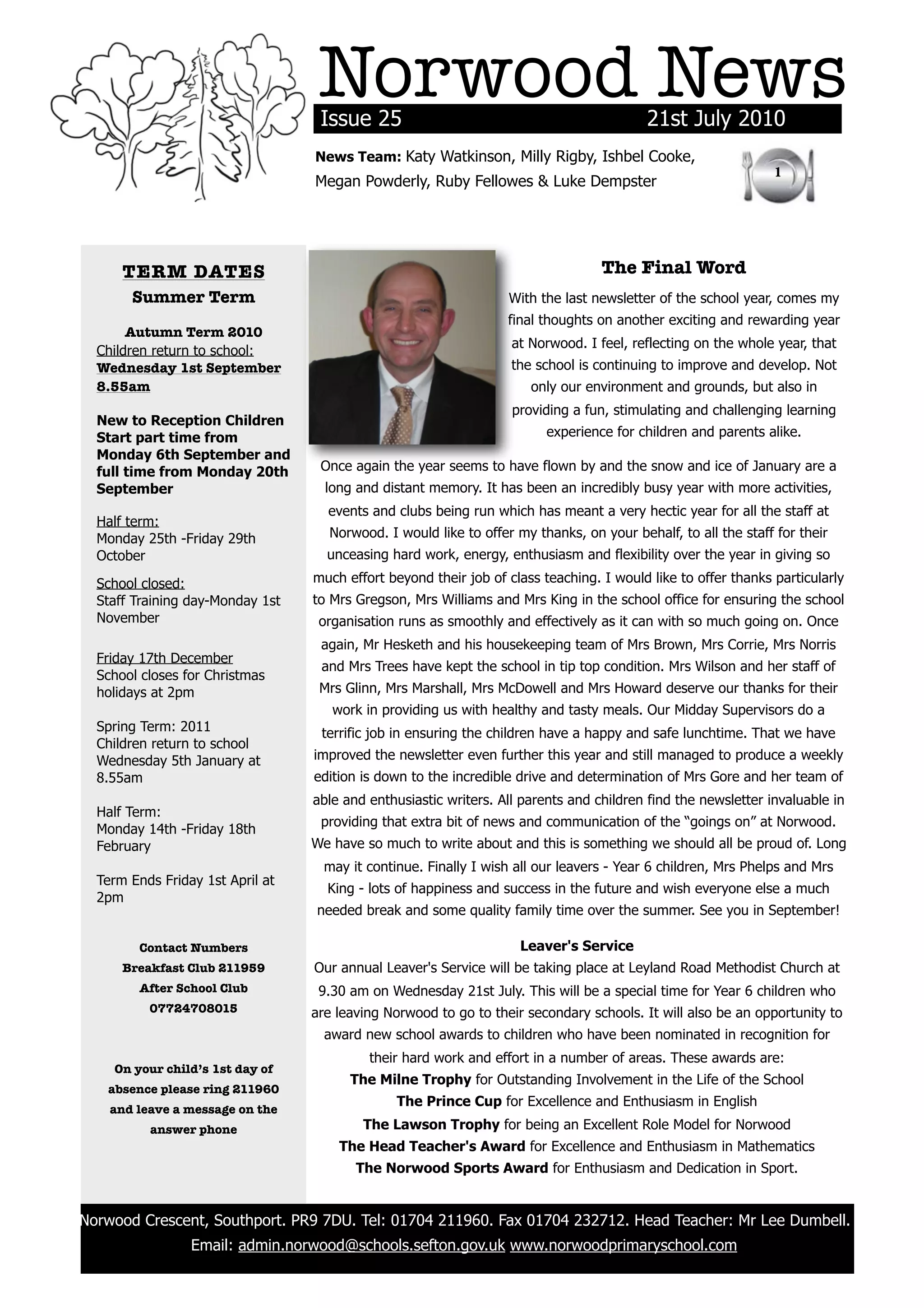 This newsletter summarizes the end of the school year at Norwood Primary School. It provides the term dates for the new school year starting in September 2010. It recognizes the hard work of the school staff over the past year and wishes the departing students and teachers well. It highlights various student achievements and upcoming events. The newsletter is intended to communicate school news to parents and students in a concise weekly format.