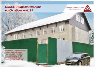 Отдельно стоящее двухэтажное здание с мансардным и цокольным этажами расположено в густонаселённом районе Казани на улице Октябрьская, вблизи крупных транспортных магистралей и остановок общественного транспорта. Здание было капитально отремонтировано в 2014 году, имеет собственную парковку и три гаражных бокса, а также готово к использованию под офис, оздоровительный центр, учебное заведение или хостел. Свойства здания включают аренду площади 250 кв.м. на каждом этаже с арендной ставкой 600 руб./кв.м.