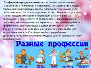 Документ обсуждает профориентацию дошкольников как новое направление в психологии и педагогике, которое начинается в младшем возрасте через знакомство с различными профессиями. Описываются методы и формы работы с детьми, направленные на повышение их познавательной активности и формирования интересов к профессиям, включая метод проектов и роль семьи в выборе профессии. Основное внимание уделяется важности поддержки со стороны взрослых для успешной профориентации детей.
