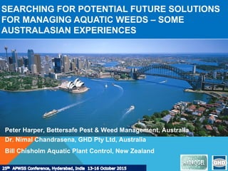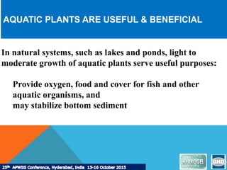 This document discusses potential future solutions for managing aquatic weeds based on experiences in Australia and New Zealand. It describes how aquatic plants can be both useful and problematic in overgrowth. Common aquatic weeds and reasons for controlling them are outlined. Methods for control include various herbicides as well as mechanical and physical removal techniques. Case studies demonstrate successful control of specific weeds like Egeria, Cabomba, and Hydrilla using herbicides in hydrogel formulations or whole lake treatments. Overall, herbicides are seen as useful when applied correctly by experts, but all aquatic weed control requires a tailored approach.