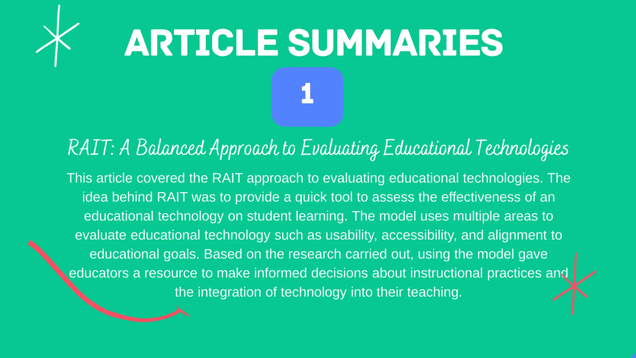 This document discussed three approaches to evaluating educational technologies: RAIT, the Technology Integration Matrix framework, and an example rubric. RAIT provides a quick assessment of an education technology's effectiveness, usability, accessibility, and alignment to goals. The Technology Integration Matrix describes five levels of technology integration in teaching. The example rubric evaluates six math learning tools based on areas like training, assignability, and data tracking to identify the best overall tool.