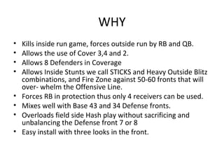 The document outlines a defensive strategy for football that emphasizes stopping the inside run game and forcing plays to the outside. It details personnel requirements, alignment, coverages, and blitz schemes to create effective pressure on the offense while allowing for various defensive front configurations. The approach aims to destabilize opposing teams by tailoring plays to exploit their weaknesses and limiting their offensive options.