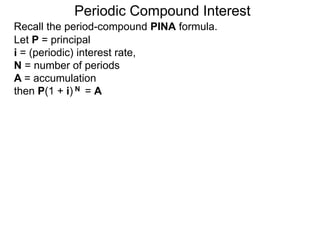 The document discusses periodic compound interest and continuous compound interest formulas. It provides an example to calculate the accumulation in an account over 20 years with an annual 8% interest rate compounded 100, 1000, and 10000 times per year. Compounding more frequently results in a larger return, approaching the continuous compound interest formula value. Compounding 10000 times per year yields the highest return of $4953.