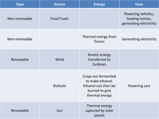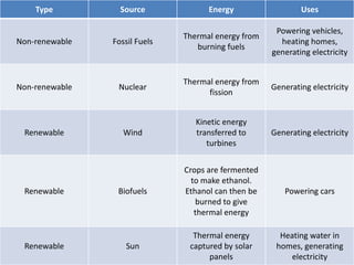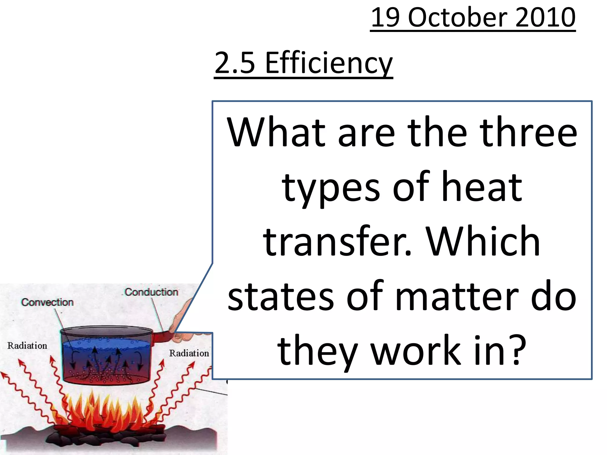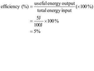This document discusses the efficiency of energy transformations and calculations. It defines efficiency as the ratio of useful energy output to total energy input. An example is provided where a desk lamp with 100J input and 5J output has an efficiency of 5%. The document also mentions the three types of heat transfer that work across different states of matter and encourages activities to identify energy waste and calculate efficiency from input/output data.