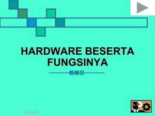 Dokumen tersebut membahas berbagai hardware komputer beserta fungsinya, diantaranya monitor, mouse, keyboard, RAM, harddisk, processor, chipset, soundcard, UPS, webcam, printer, scanner, modem, speaker, CD/DVD-rom, floppy disk drive, wifi card, router wifi, power supply, CPU fan, CMOS cell, graphic card, LAN card, TV tuner, plotter, DLP projector, barcode scanner.