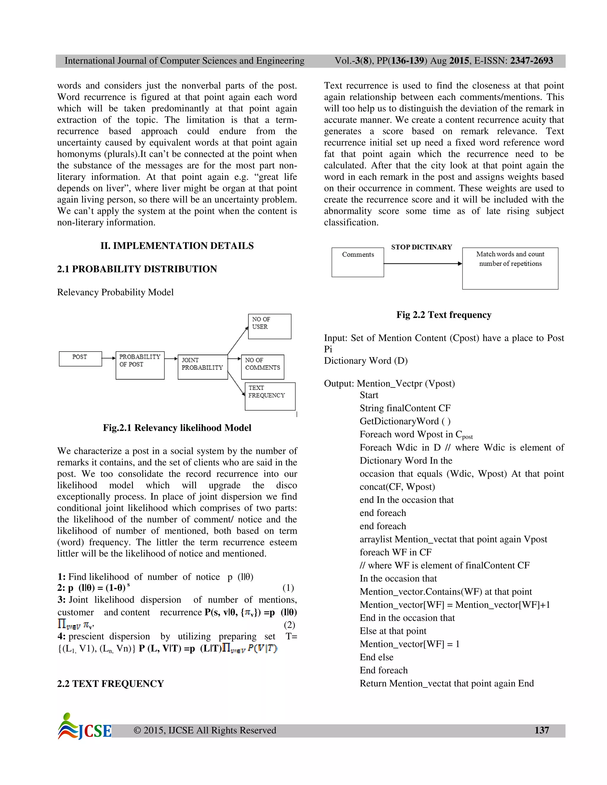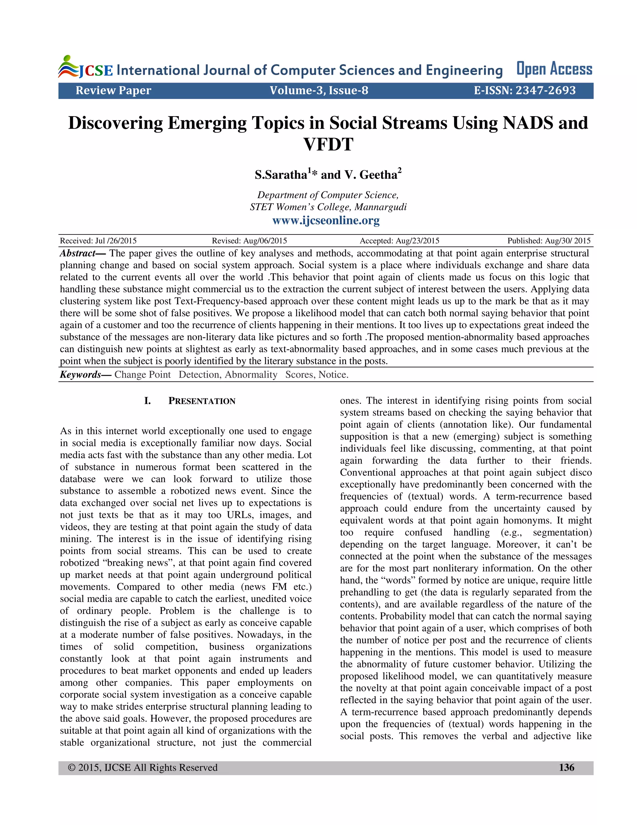This document discusses methods for discovering emerging topics in social streams using two approaches: NADS (Notice-Abnormality based Discovery of Subjects) and VFDT (Very Fast Decision Trees). It proposes a probability model that captures both the normal posting behavior of users as well as the frequency of users being mentioned in posts. This model is used to quantitatively measure the novelty and potential impact of a post based on user commenting behavior. The approaches can identify new topics as early or earlier than text-frequency based approaches, especially when topics are poorly represented by post texts alone. The document provides details on implementing the probability model, calculating text frequency scores, deriving anomaly scores, using change point detection to recognize emerging topics, and