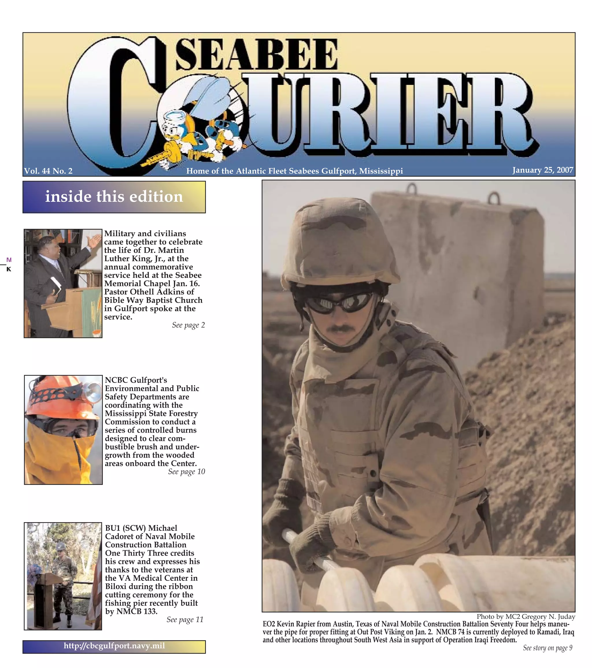 The document provides information about upcoming events and recent activities at Naval Construction Battalion Center (NCBC) Gulfport. It announces that groundbreaking for a new $41.5 million Operational Expeditionary Logistics Facility will begin in April with completion in February 2009. It also summarizes a recent project completed by Seabees of NMCB 74 in Iraq and highlights the annual Martin Luther King Jr. commemoration service held at the Seabee Memorial Chapel.