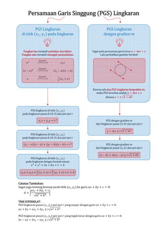 Dokumen ini membahas cara menentukan persamaan lingkaran dan garis singgung lingkaran, serta menjelaskan pola persamaan lingkaran dan aplikasi dalam menentukan pusat dan jari-jari lingkaran. Kemudian, dijelaskan juga contoh soal dan cara penyelesaian terkait garis singgung di titik tertentu pada lingkaran. Selain itu, terdapat juga penjelasan mengenai rumus jarak titik ke garis dan penerapan dalam menentukan jari-jari lingkaran.