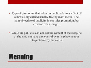 Public relations involves using mass media outlets like news stories to create a positive image for a company, product, or service rather than direct sales promotion. The objective is to present a favorable impression to customers, employees, and the public through activities like assisting with new product launches, countering negative publicity, and influencing target groups. Public relations encompasses functions such as media relations, publicity, community involvement, and promoting goodwill through various types of campaigns, publications, events, and sponsorships.