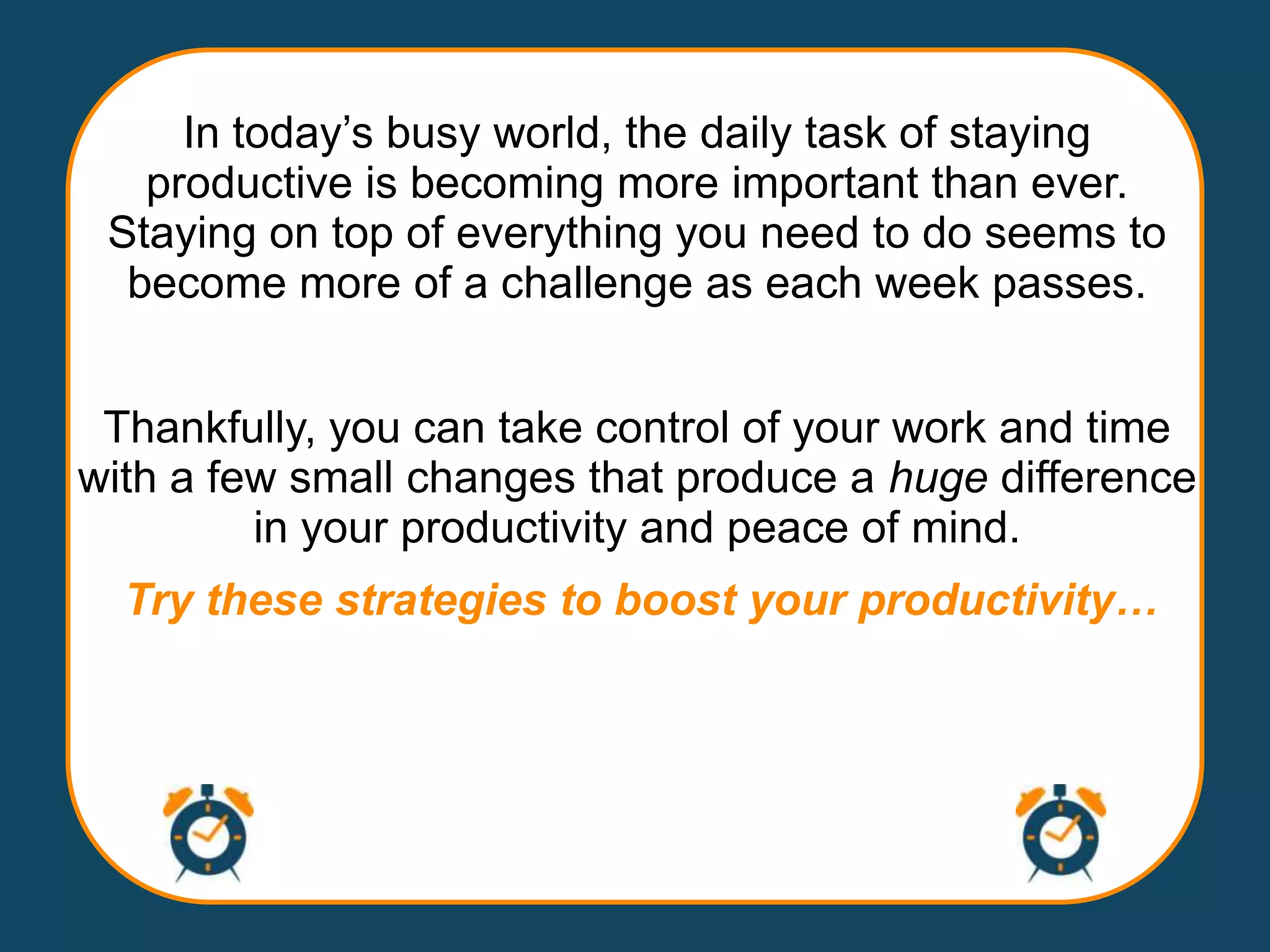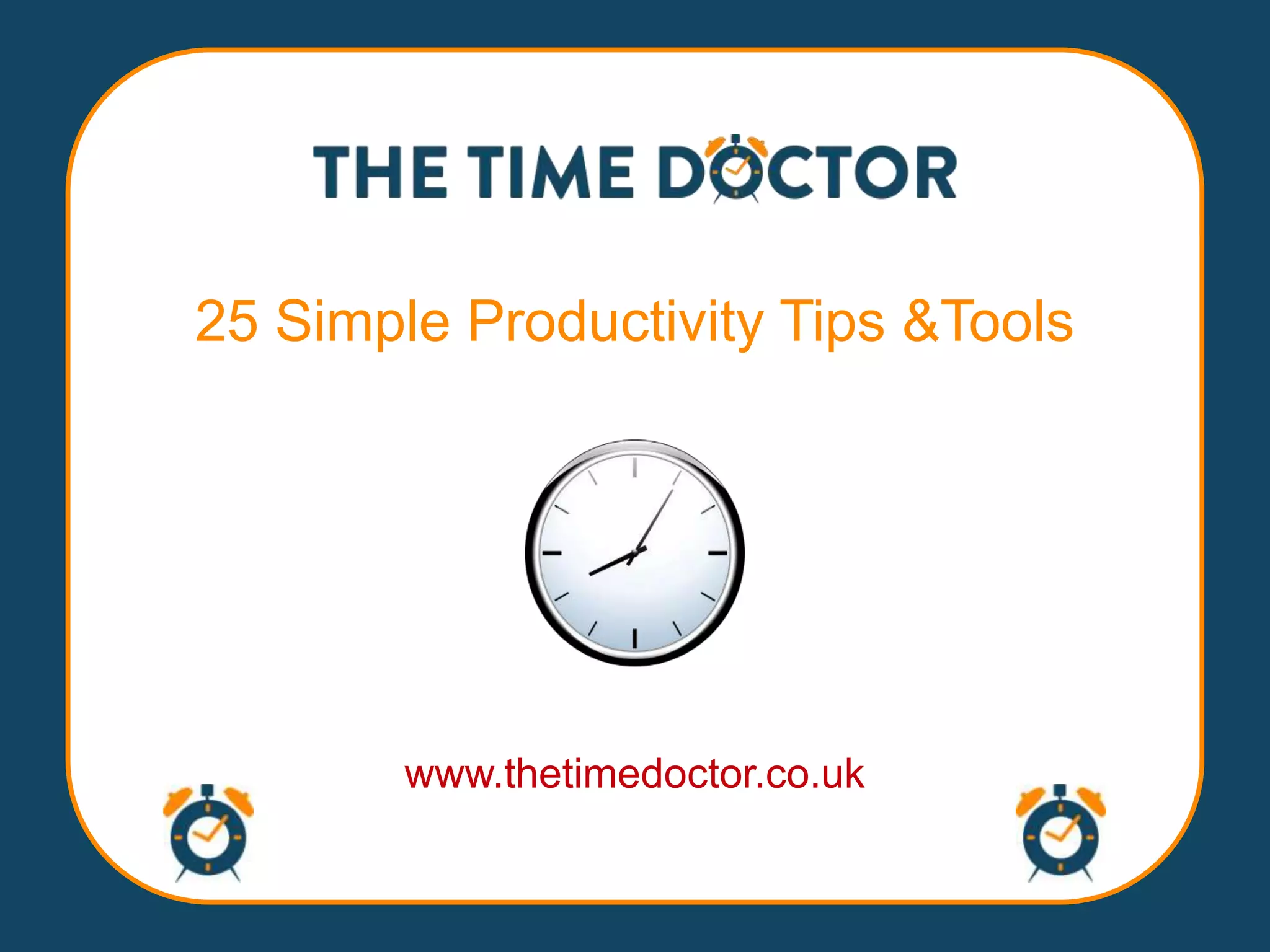 This document provides 25 tips for improving productivity. Some key tips include clearing your desk and computer desktop of clutter, limiting social media use to breaks, using to-do lists and staying focused on one task at a time instead of multitasking. It also recommends staying organized with paper and electronic files, managing email effectively, taking micro-breaks when stressed, and creating a productive work environment either with or without music. The overall message is that small changes can boost productivity.