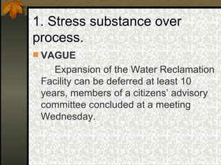 The document provides 25 tips for clearer writing from a book on media writing. Some of the key tips include stressing substance over process, using active voice, limiting "to be" verbs, clarifying ordinary words, providing direction before detail, and using comparisons to illustrate concepts.