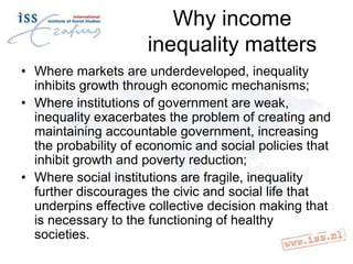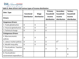 The document discusses the impact of functional income inequality on economic growth, governance, and social cohesion, emphasizing how it is exacerbated by weak institutions and social structures. It highlights the drivers of inequality such as asset distribution, wealth inequality, and the effects of the 2008 financial crisis, while suggesting that effective macroeconomic policies can mitigate these effects. The post-2015 development agenda targets reducing inequality through specific measures, urging the inclusion of inequality goals in future frameworks.