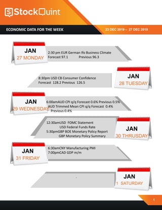 This document provides a weekly economic data calendar for the week of December 23, 2019 to December 27, 2019. It lists key economic data releases and events scheduled each day including data from the Eurozone, Australia, United States, United Kingdom, China, and Canada. This includes figures like Ifo Business Climate, CPI, FOMC statement, GDP, and various PMIs. It also includes disclaimers about investment risks and details Stockquint.com's terms of use.