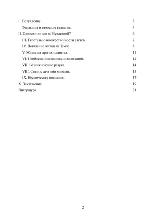 Документ представляет исследование ученика о вопросе о том, одиноки ли мы во вселенной. В нем рассматриваются темы эволюции и строения галактик, гипотез о множественности систем и появления жизни на Земле, а также возможной жизни на других планетах. Автор заключает, что возможность существования внеземных цивилизаций остается открытой и требует дальнейшего изучения.