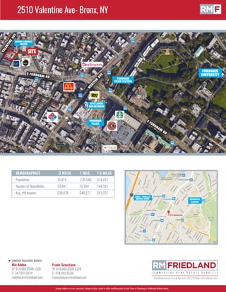 This document advertises the sale or lease of a 40,657 square foot retail space located at 2510 Valentine Ave in the Bronx near Fordham University. The property has ground floor and second and third floor retail space totaling over 31,000 square feet that is fully leased. It is in a busy commercial area with high visibility and foot traffic near public transportation. Real estate agents Mia Abdou and Frank Savastano provide contact information to inquire about purchasing or leasing the rare investment opportunity.