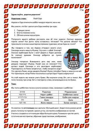 В документе обсуждается недельная глава о жизни Сары и Авраама, включая три чудеса, связанные с Сарой, и описание поиска невесты для Ицхака. Также упоминаются занятия детей, связанные с обучением алфавиту, празднованием Дня матери и зимней жизнью диких животных. Описание различных образовательных активностей подчеркивает развитие навыков счета, внимания и творчества у детей.