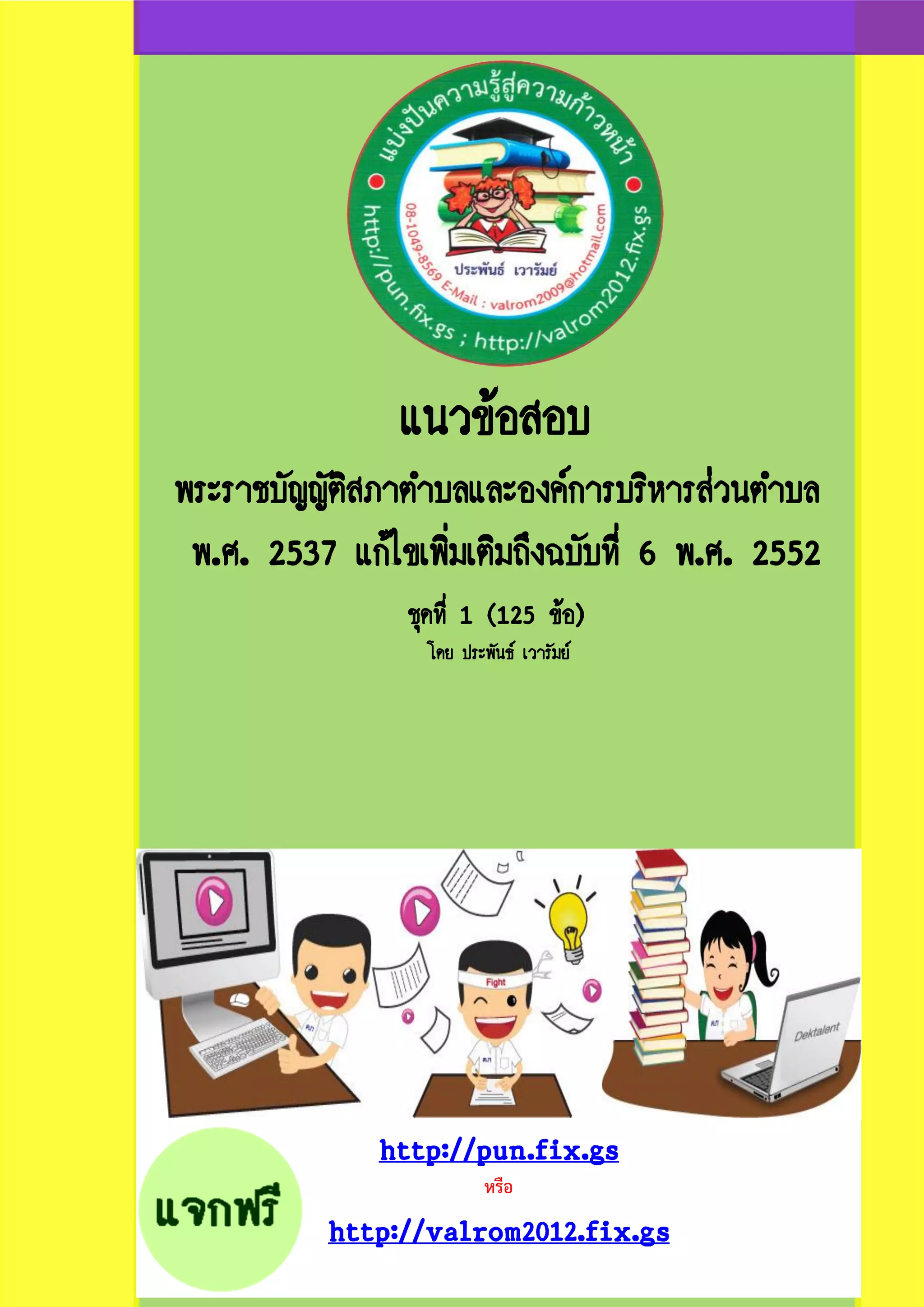 http://pun.fix.gs และ http://valrom2012.fix.gs หนา 1 แนวข้อสอบ พระราชบัญญัติสภาตําบลและองค์การบริหารส่วนตําบล พ.ศ. 2537 แก้ไขเพิ่มเติมถึงฉบับที่ 6 พ.ศ. 2552 (ชุดที่ 1) โดยประพันธ์ เวารัมย์ *************************** 1. พระราชบัญญัติสภาตําบลและองค์การบริหารส่วนตําบล พ.ศ. 2537 มีผลบังคับใช้เมื่อใด ก. 2 ธันวาคม 2537 ข. เมื่อพ้นกําหนดเก้าสิบวันนับแต่วันประกาศในราชกิจจานุเบกษา เป็นต้นไป ค. 2 มีนาคม 2538 ง. 3 มีนาคม 2538 จ. ถูกเฉพาะข้อ ข. และข้อ ค. ***************************************************** 2. พระราชบัญญัติสภาตําบลและองค์การบริหารส่วนตําบล พ.ศ. 2537 มีแก้ไขเพิ่มเติมถึงฉบับที่ 6 พ.ศ. 2552 ก. 23 ธันวาคม 2552 ข. 6 พฤศจิกายน 2552 ค. 7 พฤศจิกายน 2552 ง. วันถัดจากวันประกาศในราชกิจจานุเบกษา (วันที่ 6 พฤศจิกายน 2552) จ. วันถัดจากวันประกาศในราชกิจจานุเบกษา (วันที่ 7 พฤศจิกายน 2552) ***************************************************** 3. หน่วยการบริหารราชการส่วนท้องถิ่น หมายความว่า ข้อใดกล่าวไม่ถูกต้อง ก. องค์การบริหารส่วนจังหวัด ข. สุขาภิบาล ค. เทศบาล ง. ราชการส่วนท้องถิ่นที่มีกฎหมายจัดตั้งขึ้น จ. ไม่มีข้อใดกล่าวไม่ถูกต้อง ***************************************************** 4. ใครเป็นผู้รักษาการตามพระราชบัญญัติสภาตําบลและองค์การบริหารส่วนตําบล ก. นายกรัฐมนตรี ข. รัฐมนตรีว่าการกระทรวงมหาดไทย ค. รัฐมนตรีช่วยว่าการกระทรวงมหาดไทยซึ่งได้รับมอบหมาย ง. ปลัดกระทรวงมหาดไทย จ. อธิบดีกรมส่งเสริมการปกครองท้องถิ่น ***************************************************** 5. ใครมีอํานาจออกกฎกระทรวง ระเบียบ ข้อบังคับ ประกาศ และแต่งตั้งเจ้าหน้าที่เพื่อปฏิบัติการตาม พระราชบัญญัติสภาตําบลและองค์การบริหารส่วนตําบล
