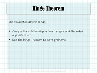 The hinge theorem states that if two sides and the included angle of one triangle are congruent to two sides and the included angle of another triangle, then the triangles are congruent. It can be used to determine if one angle is larger than another based on the lengths of the opposite sides. The document provides examples of using the hinge theorem to compare angles and their opposite sides in different triangles and determine inequalities between variables.