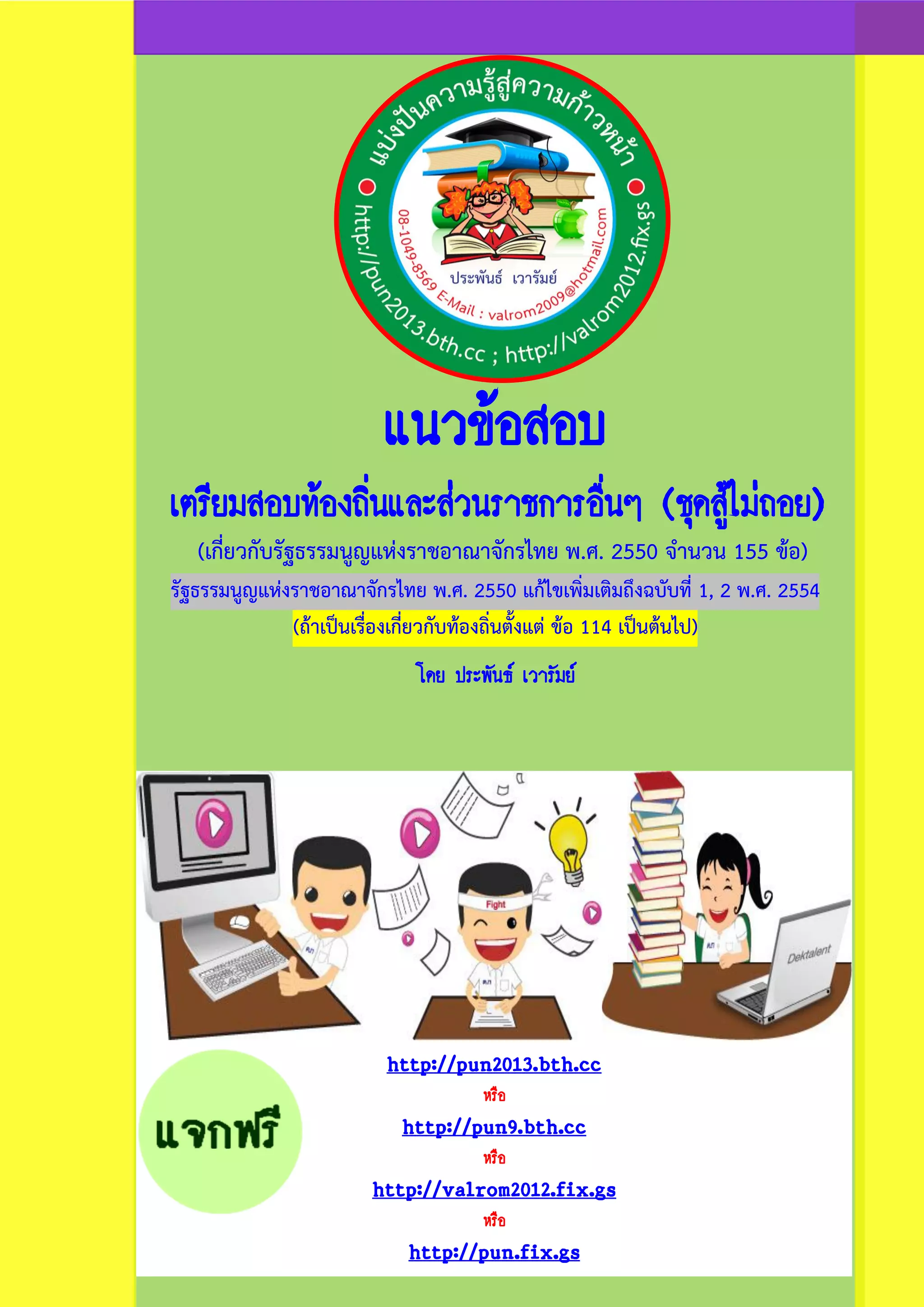 2550 จานวน 155 ข้อ) รัฐธรรมนูญแห่งราชอาณาจักรไทย พ.ศ. 2550 แก้ไขเพิ่มเติมถึงฉบับที่ 1, 2 พ.ศ. 2554 (ถ้าเป็นเรื่องเกี่ยวกับท้องถิ่นตั้งแต่ ข้อ 114 เป็นต้นไป) โดย ประพันธ์ เวารัมย์ http://pun2013.bth.cc หรือ http://pun9.bth.cc หรือ http://valrom2012.fix.gs หรือ http://pun.fix.gs