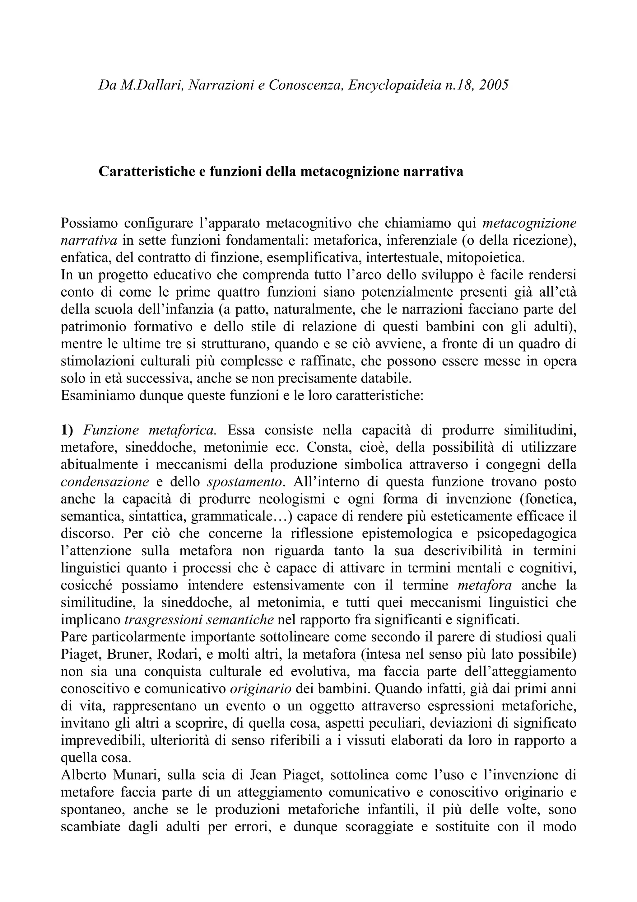 Il documento analizza le caratteristiche e le funzioni della metacognizione narrativa, identificando sette funzioni fondamentali come quella metaforica e inferenziale. Si esplora come queste funzioni possano essere presenti sin dalla scuola dell'infanzia e come la narrativa possa rafforzare il pensiero simbolico e metaforico nei bambini. Vengono inoltre discussi i processi di inferenza e ricezione nel contesto della comprensione dei testi, sottolineando l'importanza della dimensione comunicativa e del riconoscimento del messaggio da parte del ricevente.