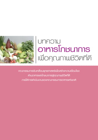 บทความอาหารและโภชนาการ เพื่อคุณภาพชีวิตที่ดี (2556) โดย คณะกรรมการขับเคลื่อนยุทธศาสตร์เพื่อสร้างความเชื่อมโยงด้านอาหารและโภชนาการสู่คุณภาพชีวิตที่ดี ภายใต้การดำเนินงานของคณะกรรมการอาหารแห่งชาติ
