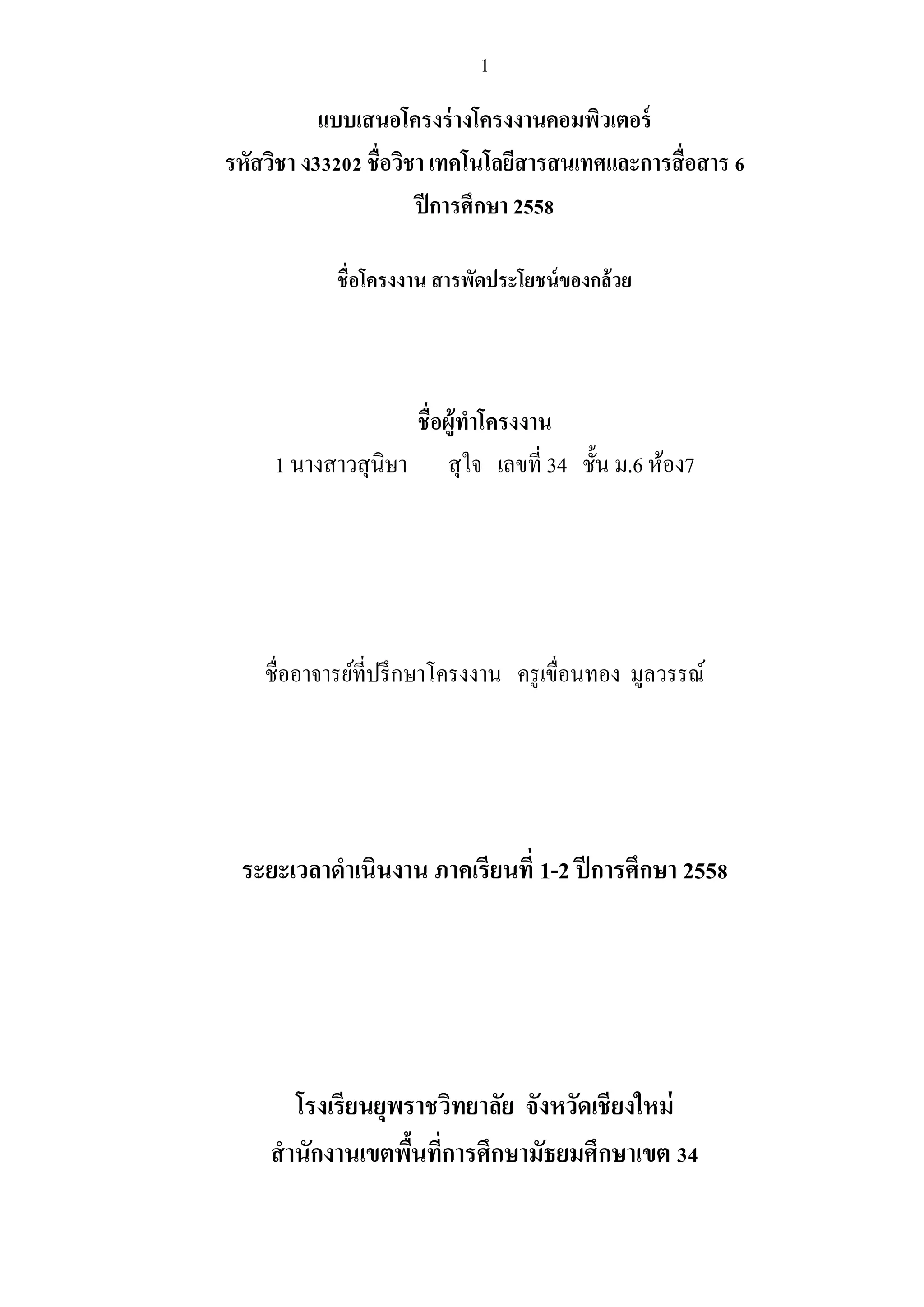 เทคโนโลยีสารสนเทศและการสื่อสาร 6 ปีการศึกษา 2558 ชื่อโครงงาน สารพัดประโยชน์ของกล้วย ชื่อผู้ทาโครงงาน 1 นางสาวสุนิษา สุใจ เลขที่ 34 ชั้น ม.6 ห้อง7 ชื่ออาจารย์ที่ปรึกษาโครงงาน ครูเขื่อนทอง มูลวรรณ์ ระยะเวลาดาเนินงาน ภาคเรียนที่ 1-2 ปีการศึกษา 2558 โรงเรียนยุพราชวิทยาลัย จังหวัดเชียงใหม่ สานักงานเขตพื้นที่การศึกษามัธยมศึกษาเขต 34