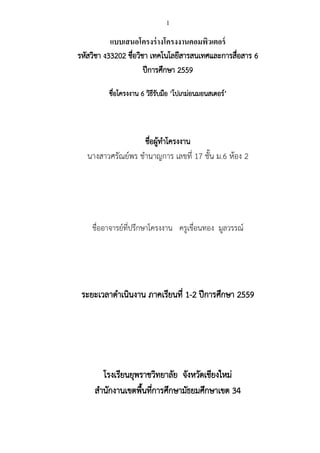 เทคโนโลยีสารสนเทศและการสื่อสาร 6 ปีการศึกษา 2559 ชื่อโครงงาน 6 วิธีรับมือ ‘โปเกม่อนมอนสเตอร์’ ชื่อผู้ทาโครงงาน นางสาวศรัณย์พร ชานาญการ เลขที่ 17 ชั้น ม.6 ห้อง 2 ชื่ออาจารย์ที่ปรึกษาโครงงาน ครูเขื่อนทอง มูลวรรณ์ ระยะเวลาดาเนินงาน ภาคเรียนที่ 1-2 ปีการศึกษา 2559 โรงเรียนยุพราชวิทยาลัย จังหวัดเชียงใหม่ สานักงานเขตพื้นที่การศึกษามัธยมศึกษาเขต 34
