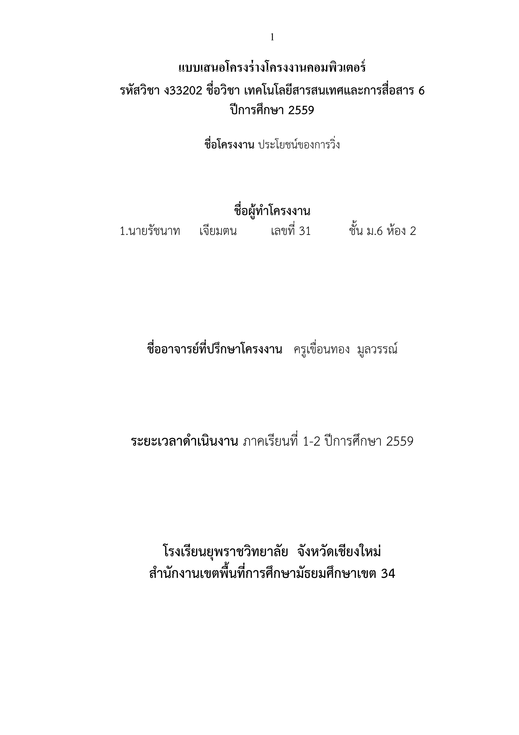 เทคโนโลยีสารสนเทศและการสื่อสาร 6 ปีการศึกษา 2559 ชื่อโครงงาน ประโยชน์ของการวิ่ง ชื่อผู้ทาโครงงาน 1.นายรัชนาท เจียมตน เลขที่ 31 ชั้น ม.6 ห้อง 2 ชื่ออาจารย์ที่ปรึกษาโครงงาน ครูเขื่อนทอง มูลวรรณ์ ระยะเวลาดาเนินงาน ภาคเรียนที่ 1-2 ปีการศึกษา 2559 โรงเรียนยุพราชวิทยาลัย จังหวัดเชียงใหม่ สานักงานเขตพื้นที่การศึกษามัธยมศึกษาเขต 34