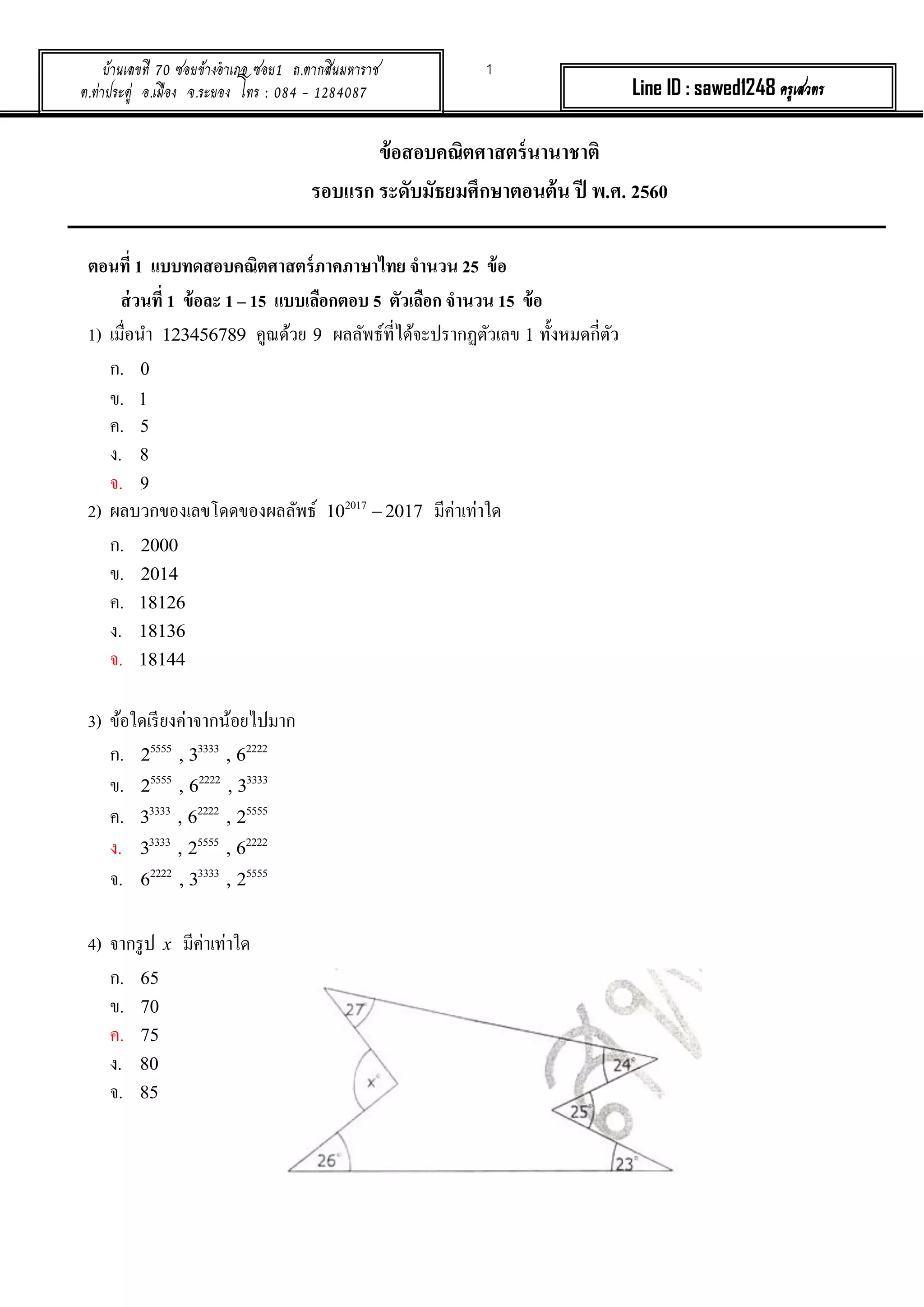 ตอนที่ 2 แบบทดสอบคณิตศาสตร์ภาคภาษาอังกฤษ จานวน 5 ข้อ
