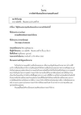 ม.6/4 เลขที่ 45 คาชี้แจง ให้ผู้เรียนแต่ละกลุ่มเขียนข้อเสนอโครงงานตามหัวข้อต่อไปนี้ ชื่อโครงงาน (ภาษาไทย) ความมหัศจรรย์ของการออกกาลังกาย ชื่อโครงงาน (ภาษาอังกฤษ) The magic of exercise ประเภทโครงงาน ให้ความรู้เชิงสุขภาพ ชื่อผู้ทาโครงงาน นาย รณัสถ์ชัย ชัยมงคล เลขที่ 45 ชั้น ม.6 ห้อง 4 ชื่อที่ปรึกษา ครูเขื่อนทอง มูลวรรณ์ ระยะเวลาดาเนินงาน ภาคเรียนที่ 1-2 ปีการศึกษา 2560 ที่มาและความสาคัญของโครงงาน ในปัจจุบันร่างกายมนุษย์มีการเคลื่อนไหวตลอดเวลา เพื่อความเจริญเติบโตและรักษาสภาพการทางานที่ดี เอาไว้ การที่ไม่ค่อยได้ออกกาลังกาย ไม่เพียงแต่จะทาให้เกิดความเสื่อมโทรมของสมรรถภาพทางกายหรือสุขภาพ แต่ ยังเป็นสาเหตุของความผิดปกติของร่างกายและโรคร้ายหลายชนิดที่ป้องกันได้ ซึ่งเป็นโรคที่เป็นปัญหาทางการแพทย์ที่ พบมากในปัจจุบัน ในทางการแพทย์ การออกกาลังกายอาจเปรียบได้กับยาสารพัดประโยชน์ เพราะใช้เป็นยาบารุง เป็นยาป้องกันและเป็นยาบาบัดรักษาหรือฟื้นฟูสภาพร่างกาย แต่การที่ได้ชื่อว่ายาแล้วไม่ว่าจะวิเศษเพียงไรก็จะต้องใช้ ด้วยขนาดหรือปริมาณที่เหมาะสมกับคนแต่ละคน ในคนที่ใช้โดยไม่คานึงถึงขนาดหรือปริมาณที่เหมาะสม นอกจาก อาจไม่ได้ผลแล้วยังอาจเกิดโทษจากยาได้ด้วย การออกกาลังกายให้เกิดประโยชน์แก่สุขภาพคือ การจัดชนิดของความ หนัก ความนาน และความบ่อยของการออกกาลังกายให้เหมาะสมกับเพศ วัย สภาพร่างกาย สภาพแวดล้อม และ จุดประสงค์ของแต่ละคน ด้วยเหตุนี้จึงสนใจศึกษาเรื่องของความมหัศจรรย์ของการออกกาลังกาย