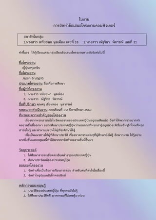 เลขที่ 18 2.นางสาว ณัฐริกา พิจารณ์ เลขที่ 21 คาชี้แจง ให้ผู้เรียนแต่ละกลุ่มเขียนข้อเสนอโครงงานตามหัวข้อต่อไปนี้ ชื่อโครงงาน ญี่ปุ่นกรุบกริบ ชื่อโครงงาน Japan Grubgrib ประเภทโครงงาน สื่อเพื่อการศึกษา ชื่อผู้ทาโครงงาน 1. นางสาว หทัยชนก มูลเมือง 2. นางสาว ณัฐริกา พิจารณ์ ชื่อที่ปรึกษา คุณครู เขื่อนทอง มูลวรรณ์ ระยะเวลาดาเนินงาน ภาคเรียนที่ 1-2 ปีการศึกษา 2560 ที่มาและความสาคัญของโครงงาน เนื่องจากพวกเราสนใจในวัฒนธรรมของประเทศญี่ปุ่นอยู่ทุนเดิมแล้ว ยิ่งทาให้พวกเราอยากทา ผลงานชิ้นนี้ออกมา อยากศึกษาประเทศญี่ปุ่นว่านอกจากที่พวกเรารู้อยู่แล้วจะมีเรื่องอื่นๆอีกไหมที่พวก เรายังไม่รู้ และนามาแบ่งปันให้ผู้ที่จะศึกษาได้รู้ เพื่อเป็นแนวทางให้ผู้ที่ศึกษาประวัติ เรื่องฆาตกรรมต่างๆที่ผู้ศึกษายังไม่รู้ อีกมากมาย ให้รู้อย่าง มากยิ่งขึ้นและเหตุผลนี้ทาให้พวกเราจัดทาผลงานชิ้นนี้ขึ้นมา วัตถุประสงค์ 1. ได้ศึกษาลายละเอียดละเอียดต่างๆของประเทศญี่ปุ่น 2. ศึกษาประวัตคดีของประเทศญี่ปุ่น ขอบเขตโครงงาน 1. จัดทาเพื่อเป็นสือการเรียนการสอน สาหรับคนที่สนใจในเรื่องนี้ 2. จัดทาในรูปแบบอิเล็กทรอนิกส์ หลักการและทฤษฎี 1. ประวัติของประเทศญี่ปุ่น ที่ทุกคนยังไม่รู้ 2. ได้ศึกษาประวัติคดี ฆาตกรรมที่ไม่เคยรู้มาก่อน