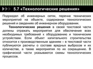 Документ содержит раздел 5.7 'технологические решения', который описывает требования к проектной документации для различных типов объектов, включая жилые, производственные и общественные здания. В нем оговариваются необходимые расчеты, решения по технологическим процессам и требования к инженерным системам для обеспечения безопасности и комфорта. Также упоминаются нормативные документы и задачи разработки технологических решений для строительства.