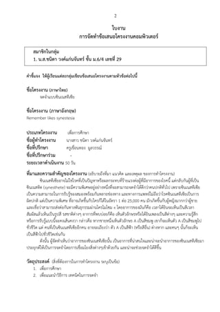ชั้น ม.6/4 เลขที่ 29 คาชี้แจง ให้ผู้เรียนแต่ละกลุ่มเขียนข้อเสนอโครงงานตามหัวข้อต่อไปนี้ ชื่อโครงงาน (ภาษาไทย) จดจาแบบซินเนสทีเซีย ชื่อโครงงาน (ภาษาอังกฤษ) Remember likes synestesia ประเภทโครงงาน เพื่อการศึกษา ชื่อผู้ทาโครงงาน นางสาว ชนิตา วงค์แก่นจันทร์ ชื่อที่ปรึกษา ครูเขื่อนทอง มูลวรรณ์ ชื่อที่ปรึกษาร่วม - ระยะเวลาดาเนินงาน 50 วัน ที่มาและความสาคัญของโครงงาน (อธิบายถึงที่มา แนวคิด และเหตุผล ของการทาโครงงาน) ซินเนสทีเซียอาจไม่ใช่โรคที่เป็นปัญหาหรือผลกระทบที่ร้ายแรงต่อผู้ที่มีอาการของโรคนี้ แต่กลับกันผู้ที่เป็น ซินเนสทิต (synesthete) จะมีความพิเศษอยู่อย่างหนึ่งที่จะสามารถจดจาได้ดีกว่าคนปกติทั่วไป เพราะซินเนสทีเซีย เป็นความสามารถในการรับรู้ของสมองพร้อมกันหลายช่องทาง และทางการแพทย์ไม่ถือว่าโรคซินเนสทีเซียเป็นการ ผิดปกติ แต่เป็นความพิเศษ ที่อาจเกิดขึ้นกับใครก็ได้ในอัตรา 1 ต่อ 25,000 คน มักเกิดขึ้นกับผู้หญิงมากกว่าผู้ชาย และเชื่อว่าสามารถส่งต่อกันทางพันธุกรรมผ่านโครโมโซม x โดยอาการของมันก็คือ เวลาได้ยินจะเห็นเป็นสีเวลา สัมผัสแล้วเห็นเป็นรูปสี รสชาติต่างๆ อาการที่พบบ่อยก็คือ เห็นตัวอักษรหรือได้ยินเพลงเป็นสีต่างๆ และความรู้สึก หรือการรับรู้แบบนี้จะคงเส้นคงวา กล่าวคือ หากชายหนึ่งเห็นตัวอักษร A เป็นสีชมพู เขาก็จะเห็นตัว A เป็นสีชมพูไป ชั่วชีวิต แต่ คนที่เป็นซินเนสทีเซียอีกคน อาจจะเถียงว่า ตัว A เป็นสีฟ้า (หรือสีอื่น) ต่างหาก และคนๆ นั้นก็จะเห็น เป็นสีฟ้าไปชั่วชีวิตเช่นกัน ดังนั้น ผู้จัดทาเห็นว่าอาการของซินเนสทีเซียนั้น เป็นอาการที่น่าสนใจและน่าจะนาอาการของซินเนสทีเซียมา ประยุกต์ให้เป็นการจดจาโดยการเชื่อมโยงสิ่งต่างๆเข้าด้วยกัน และน่าจะช่วยจดจาได้ดีขึ้น วัตถุประสงค์ (สิ่งที่ต้องการในการทาโครงงาน ระบุเป็นข้อ) 1. เพื่อการศึกษา 2. เพื่อแนะนาวิธีการ เทคนิคในการจดจา