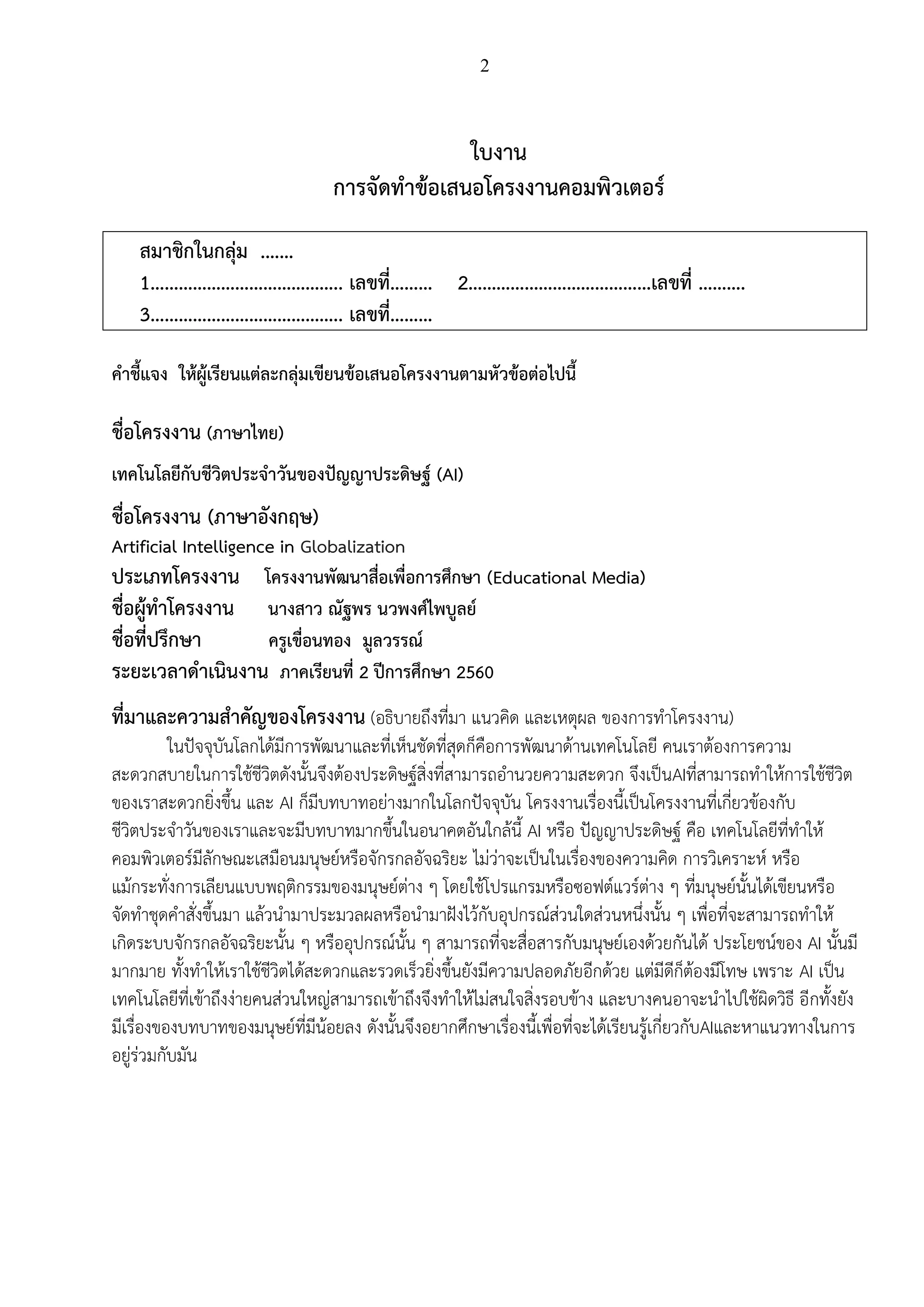 2…………………………………เลขที่ ………. 3………………………………….. เลขที่……… คาชี้แจง ให้ผู้เรียนแต่ละกลุ่มเขียนข้อเสนอโครงงานตามหัวข้อต่อไปนี้ ชื่อโครงงาน (ภาษาไทย) เทคโนโลยีกับชีวิตประจาวันของปัญญาประดิษฐ์ (AI) ชื่อโครงงาน (ภาษาอังกฤษ) Artificial Intelligence in Globalization ประเภทโครงงาน โครงงานพัฒนาสื่อเพื่อการศึกษา (Educational Media) ชื่อผู้ทาโครงงาน นางสาว ณัฐพร นวพงศ์ไพบูลย์ ชื่อที่ปรึกษา ครูเขื่อนทอง มูลวรรณ์ ระยะเวลาดาเนินงาน ภาคเรียนที่ 2 ปีการศึกษา 2560 ที่มาและความสาคัญของโครงงาน (อธิบายถึงที่มา แนวคิด และเหตุผล ของการทาโครงงาน) ในปัจจุบันโลกได้มีการพัฒนาและที่เห็นชัดที่สุดก็คือการพัฒนาด้านเทคโนโลยี คนเราต้องการความ สะดวกสบายในการใช้ชีวิตดังนั้นจึงต้องประดิษฐ์สิ่งที่สามารถอานวยความสะดวก จึงเป็นAIที่สามารถทาให้การใช้ชีวิต ของเราสะดวกยิ่งขึ้น และ AI ก็มีบทบาทอย่างมากในโลกปัจจุบัน โครงงานเรื่องนี้เป็นโครงงานที่เกี่ยวข้องกับ ชีวิตประจาวันของเราและจะมีบทบาทมากขึ้นในอนาคตอันใกล้นี้ AI หรือ ปัญญาประดิษฐ์ คือ เทคโนโลยีที่ทาให้ คอมพิวเตอร์มีลักษณะเสมือนมนุษย์หรือจักรกลอัจฉริยะ ไม่ว่าจะเป็นในเรื่องของความคิด การวิเคราะห์ หรือ แม้กระทั่งการเลียนแบบพฤติกรรมของมนุษย์ต่าง ๆ โดยใช้โปรแกรมหรือซอฟต์แวร์ต่าง ๆ ที่มนุษย์นั้นได้เขียนหรือ จัดทาชุดคาสั่งขึ้นมา แล้วนามาประมวลผลหรือนามาฝังไว้กับอุปกรณ์ส่วนใดส่วนหนึ่งนั้น ๆ เพื่อที่จะสามารถทาให้ เกิดระบบจักรกลอัจฉริยะนั้น ๆ หรืออุปกรณ์นั้น ๆ สามารถที่จะสื่อสารกับมนุษย์เองด้วยกันได้ ประโยชน์ของ AI นั้นมี มากมาย ทั้งทาให้เราใช้ชีวิตได้สะดวกและรวดเร็วยิ่งขึ้นยังมีความปลอดภัยอีกด้วย แต่มีดีก็ต้องมีโทษ เพราะ AI เป็น เทคโนโลยีที่เข้าถึงง่ายคนส่วนใหญ่สามารถเข้าถึงจึงทาให้ไม่สนใจสิ่งรอบข้าง และบางคนอาจะนาไปใช้ผิดวิธี อีกทั้งยัง มีเรื่องของบทบาทของมนุษย์ที่มีน้อยลง ดังนั้นจึงอยากศึกษาเรื่องนี้เพื่อที่จะได้เรียนรู้เกี่ยวกับAIและหาแนวทางในการ อยู่ร่วมกับมัน