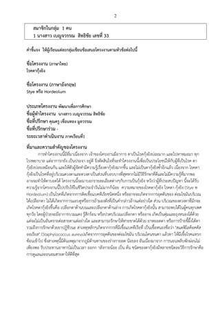 นางสาว เบญจวรรณ สิทธิชัย เลขที่ 33 คาชี้แจง ให้ผู้เรียนแต่ละกลุ่มเขียนข้อเสนอโครงงานตามหัวข้อต่อไปนี้ ชื่อโครงงาน (ภาษาไทย) โรคตากุ้งยิง ชื่อโครงงาน (ภาษาอังกฤษ) Stye หรือ Hordeolum ประเภทโครงงาน พัฒนาเพื่อการศึกษา ชื่อผู้ทาโครงงาน นางสาว เบญจวรรณ สิทธิชัย ชื่อที่ปรึกษา คุณครู เขื่อนทอง มูลวรรณ ชื่อที่ปรึกษาร่วม - ระยะเวลาดาเนินงาน ภาคเรียนที่1 ที่มาและความสาคัญของโครงงาน การทาโครงงานนี้มีที่มาเนื่องจาก เจ้าของโครงงานมีอาการ ตาเป็นโรคกุ้งยิงบ่อยมาก และไปหาหมอมา ทุก โรงพยาบาล แต่อาการกยัง เป็นประจา อยู่ดี จึงตัดสินใจที่จะทาโครงงานนี้เพื่อเป็นประโยชน์ให้กับผู้ที่เป็นโรค ตา กุ้งยิงบ่อยเหมือนกัน และให้ตัวผู้จัดทามีความรู้เรื่องตากุ้งยิงมากขึ้น และไม่เป็นตากุ้งยิงซ้าอีกแล้ว เนื่องจาก โรคตา กุ้งยิงเป็นโรคที่อยู่บริเวณดวงตาและดวงตาเป็นส่วนที่บอบบางที่สุดหากไม่มีวิธีรักษาที่ดีและไม่มีความรู้ที่มากพอ อาจจะทาให้ตาบอดได้ โครงงานนี้จะมาบอกรายละเอียดต่างๆกับการเป็นกุ้งยิง หวังว่าผู้ที่ประสบปัญหา นี้จะได้รับ ความรู้จากโครงงานนี้ไปปรับใช้ในชีวิตประจาวันไม่มากก็น้อย ความหมายของโรคตากุ้งยิง โรคตา กุ้งยิง (Stye ห Hordeolum) เป็นโรคที่เกิดจากการติดเชื้อแบคทีเรียชนิดหนึ่ง หรืออาจจะเกิดจากการอุดตันของ ต่อมไขมันบริเวณ ใต้เปลือกตา ไม่ได้เกิดจากการแอบดูหรือการถ้ามองดังที่เป็นคากล่าวอ้างแต่อย่างใด ส่วน บริเวณของดวงตาที่มักจะ เกิดโรคตากุ้งยิงขึ้นคือ เปลือกตาด้านบนและเปลือกตาด้านล่าง การเกิดโรคตากุ้งยิงนั้น สามารถพบได้ในผู้คนทุกเพศ ทุกวัย โดยผู้ป่วยจะมีอาการบวมแดง รู้สึกร้อน หรือปวดบริเวณเปลือกตา หรืออาจ เกิดเป็นตุ่มและถุงหนองได้ด้วย แต่จะไม่เป็นอันตรายต่อสายตาแต่อย่างใด และสามารถรักษาให้หายขาดได้ด้วย ยาหยอดตา หรือการป้ายขี้ผึ้งใต้ตา รวมถึงการรักษาด้วยยาปฏิชีวนะ สาเหตุหลักๆเกิดจากการที่มีเชื้อแบคทีเรียที่ เป็นเชื้อหนองชื่อว่า "สแตฟิโลค็อคคัส ออเรียส" (Staphylococcus aureus)เกิดจากการอุดตันของต่อมไขมัน บริเวณโคนขนตา แล้วทา ให้มีเชื้อโรคแทรก ซ้อนเข้าไป ซึ่งสาเหตุนี้มีต้นเหตุมาจากภูมิต้านทานของร่างกายลด น้อยลง อันเนื่องมาจาก การนอนหลับพักผ่อนไม่ เพียงพอ รับประทานอาหารไม่เป็นเวลา ออกก าลังกายน้อย เป็น ต้น ชนิดของตากุ้งยิงมีหลายชนิดละวิธีการรักษาคือ การดูแลและถนอมสายตาให้ดีที่สุด