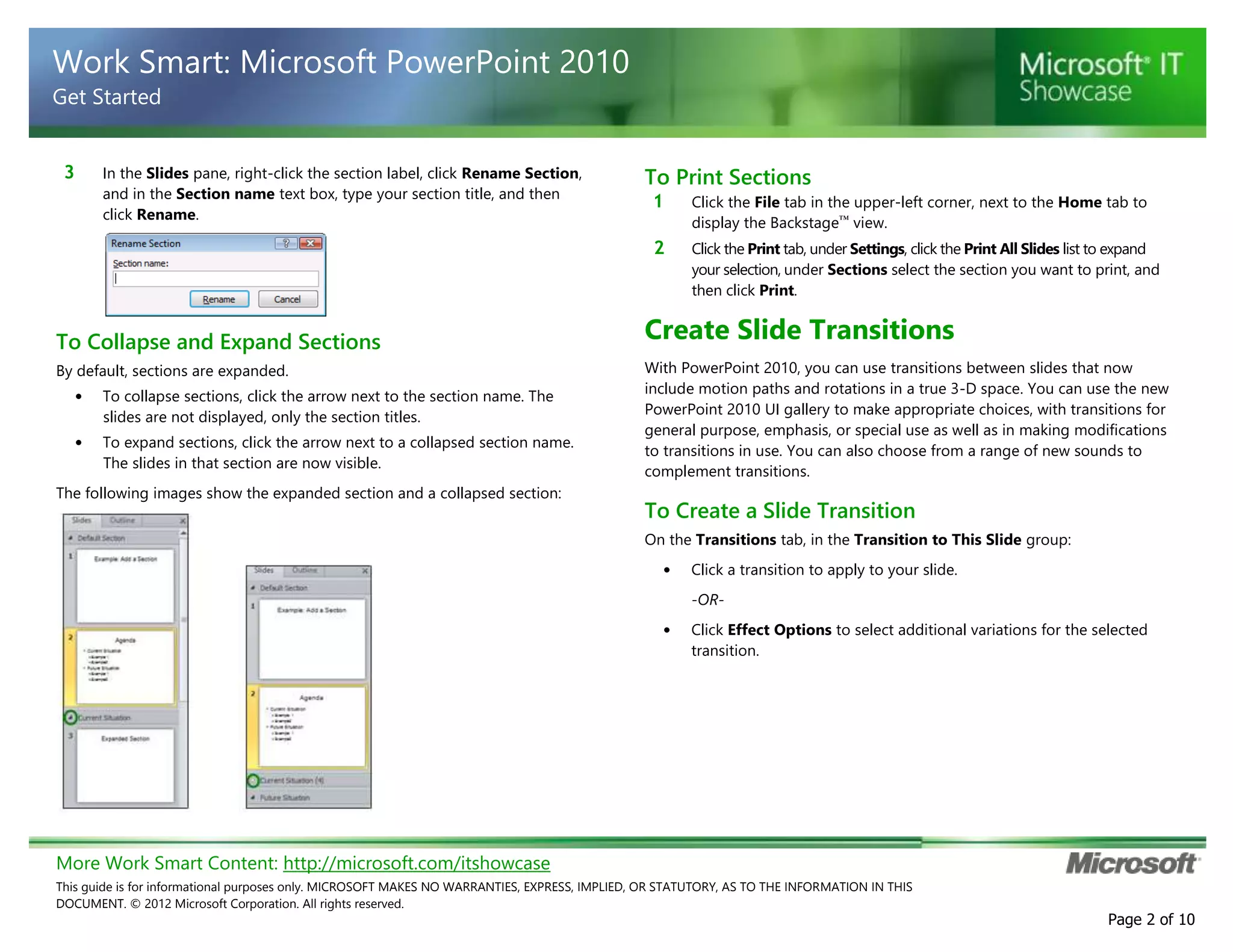This document provides guidance on using various features in Microsoft PowerPoint 2010, including adding slide sections and transitions, using animation painter, enabling co-authoring of presentations, comparing and merging presentations, creating broadcast slide shows, inserting and editing videos, creating videos from presentations, and making presentations portable. It offers step-by-step instructions on how to utilize these tools to organize, customize, and share presentations.