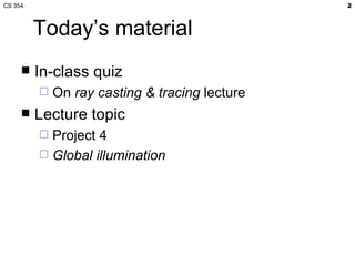 This document summarizes a class lecture on global illumination techniques for computer graphics. It discusses ray tracing and path tracing to solve the rendering equation through Monte Carlo integration. Radiosity for diffuse interreflection using form factors is covered. Participating media and photon mapping are also summarized. The next class will cover acceleration structures to speed up ray tracing computations. Project 4 is assigned, involving implementing a simple ray tracer.