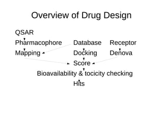 This document provides an overview of QSAR (Quantitative Structure-Activity Relationship) modeling, which establishes mathematical relationships between chemical structure descriptors of molecules and their biological activity. It discusses how QSAR analysis involves statistically analyzing properties of known active molecules to develop models that can then predict activity of new compounds. Examples of using QSAR to optimize ligand structures and select candidates for further testing are also provided.